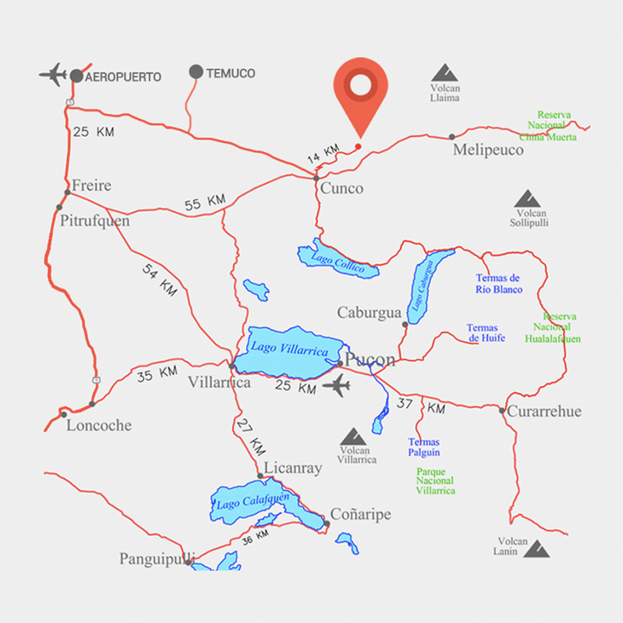 • A solo 73 kilómetros bypass de Temuco. • A solo 74 kilómetros de Villarrica. • A solo 14 kilómetros de Cunco. • A 745 kilómetros de Santiago.